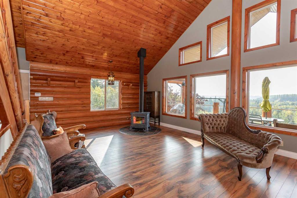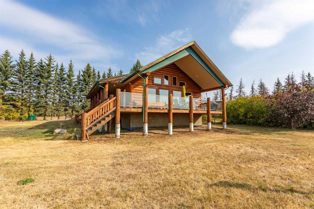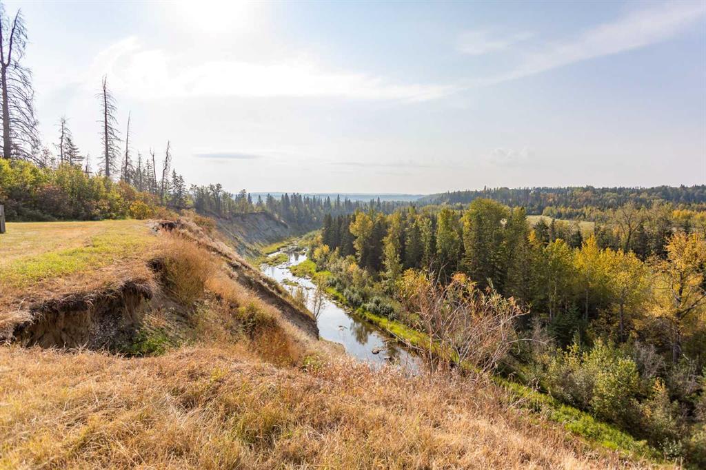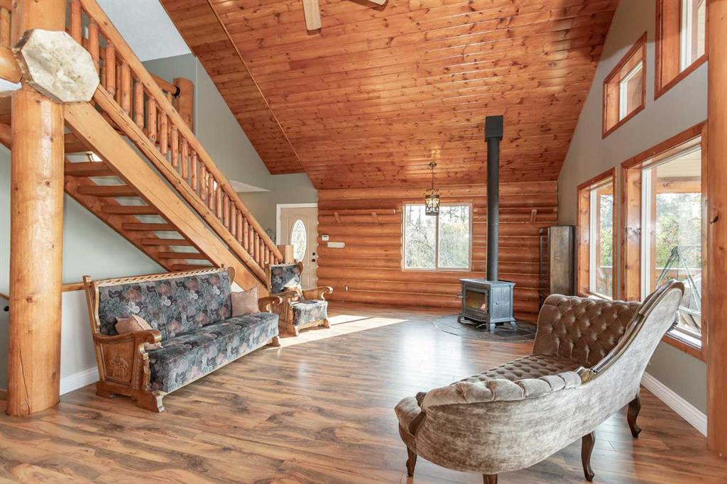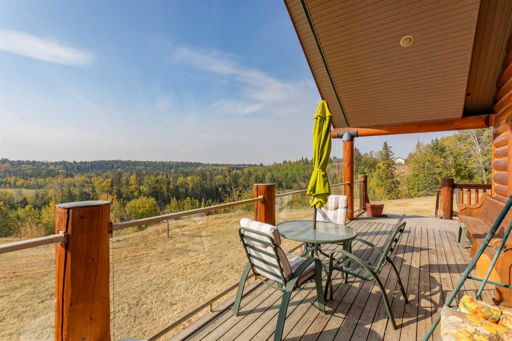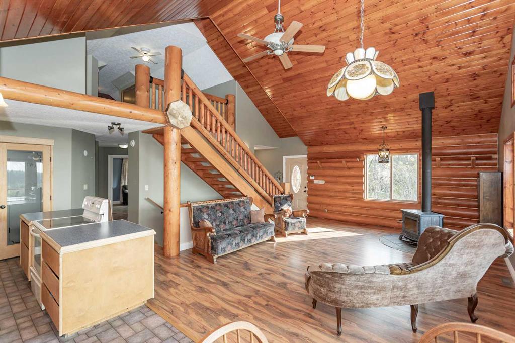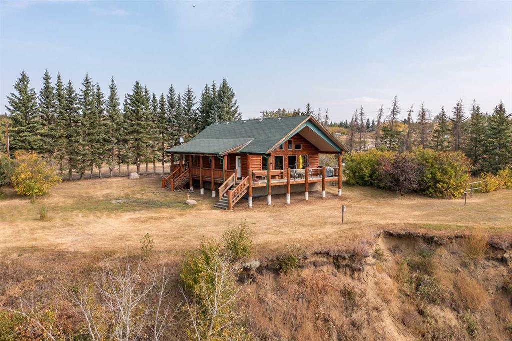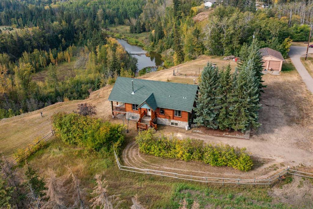 Set on 5.54 acres above the Blindman River, this log-style 1.5 storey home offers a peaceful setting with wide-open valley views and plenty of space to enjoy country living. The main floor is bright and welcoming, featuring a spacious living room with a wood stove, large south-facing windows, and direct access to the full wrap-around deck. The kitchen is practical and inviting with oak cabinetry, laminate countertops, a walk-in pantry, and a comfortable dining area. Two well-sized bedrooms, a 3-piece bathro...